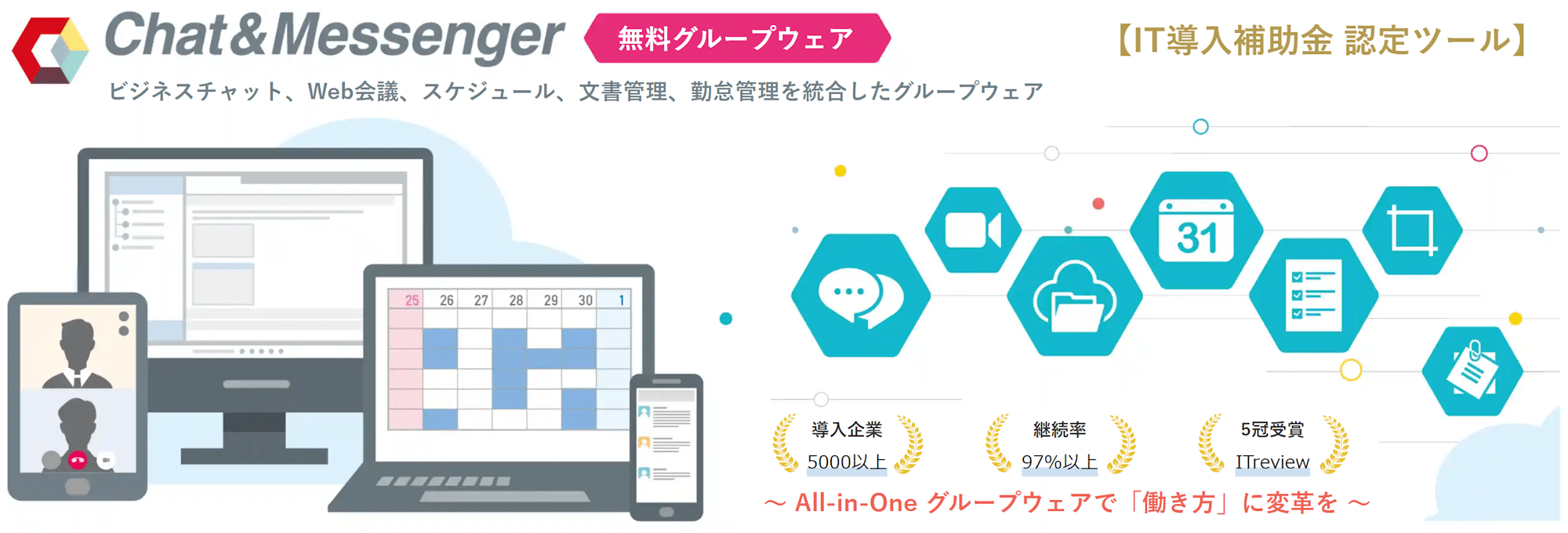 Chat&Messengerは、ビジネスチャット、Web会議、スケジュール、文書、ワークフロー、勤怠を統合した国産グループウェア。