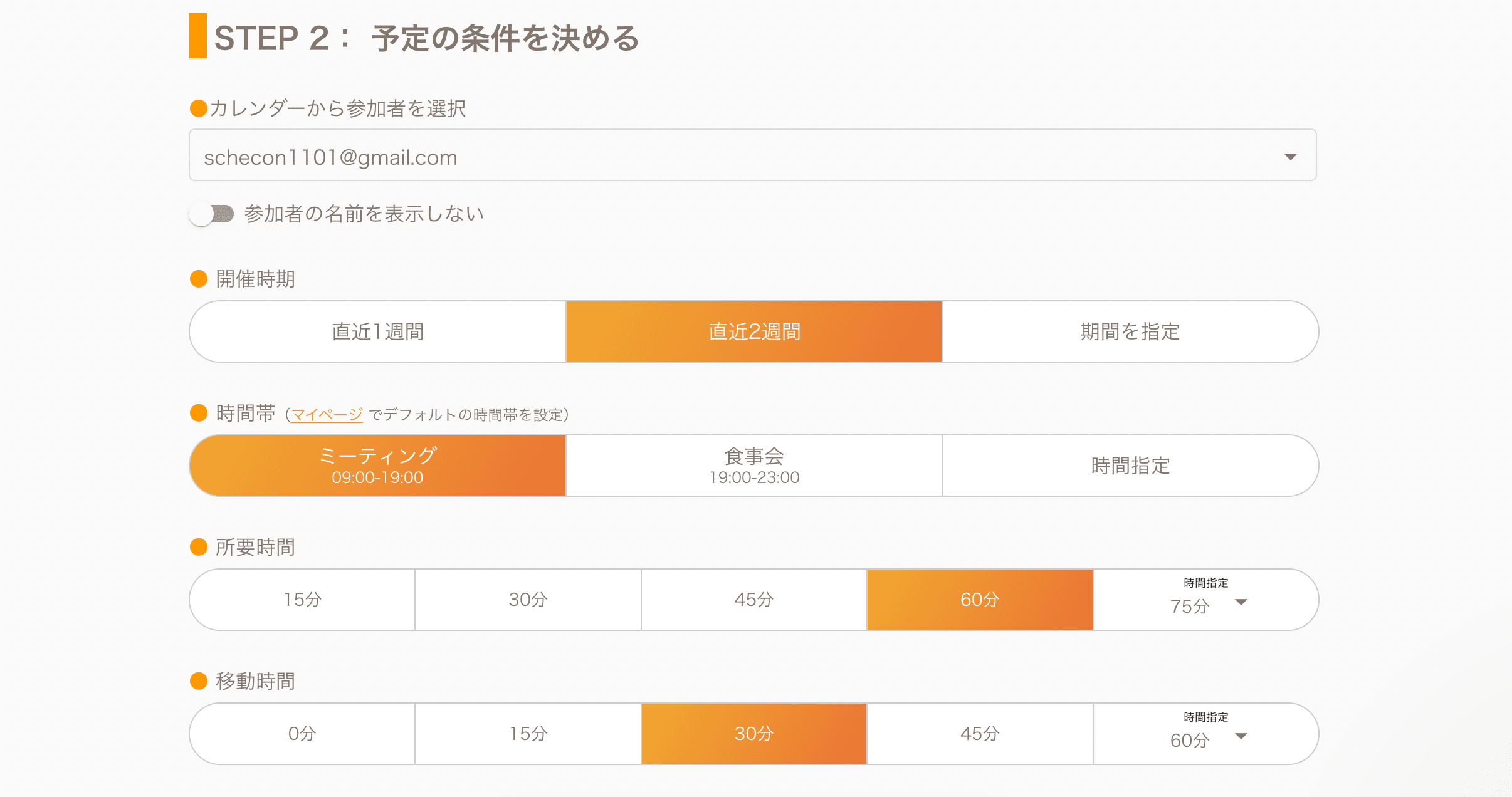 開催時期は予定を開催したい日付や時間帯のほか、所要時間もあらかじめ設定できます。