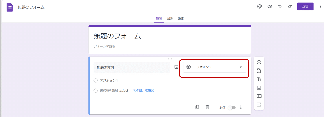 「ラジオボタン」をクリックすると、回答方法を記述や選択に変更可能。選択形式で回答できるようにすると、回答する方の手間が省けます。