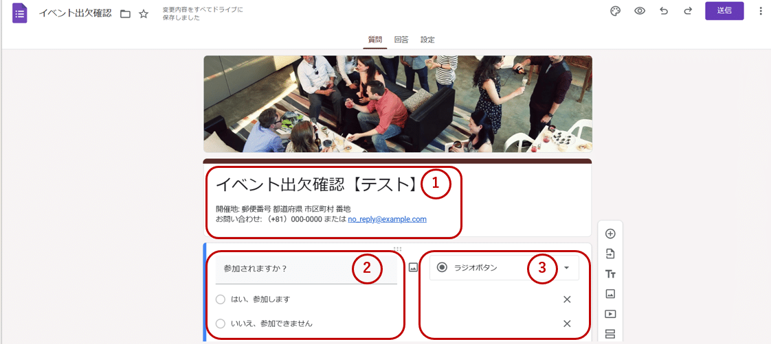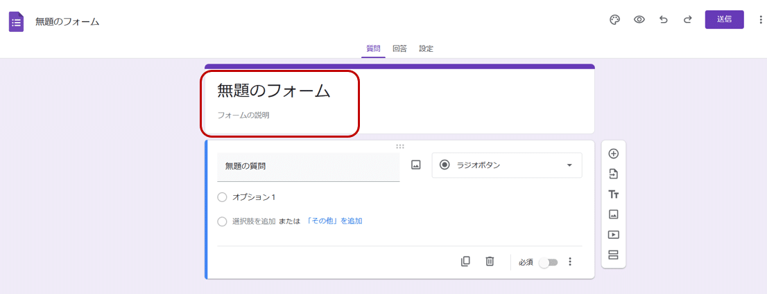 「無題のフォーム」「フォームの説明」部分に、イベントや会議の名前や開催場所の説明を入力しましょう。