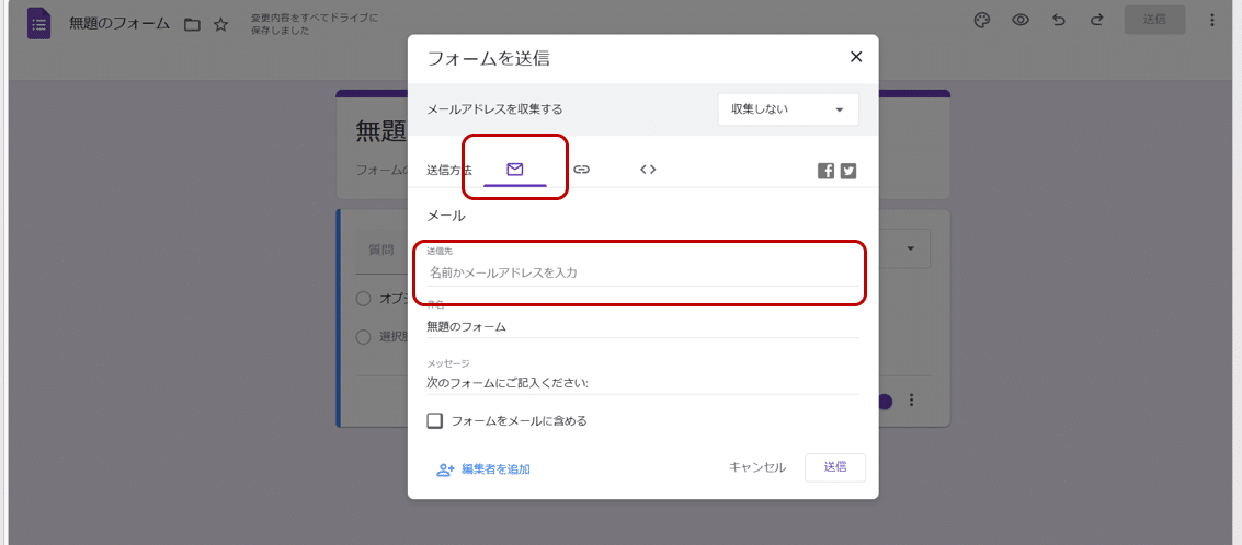 メールアイコンが選択されていることを確認したら、アンケートを送りたい方のメールアドレスやメッセージを入力して送信しましょう。