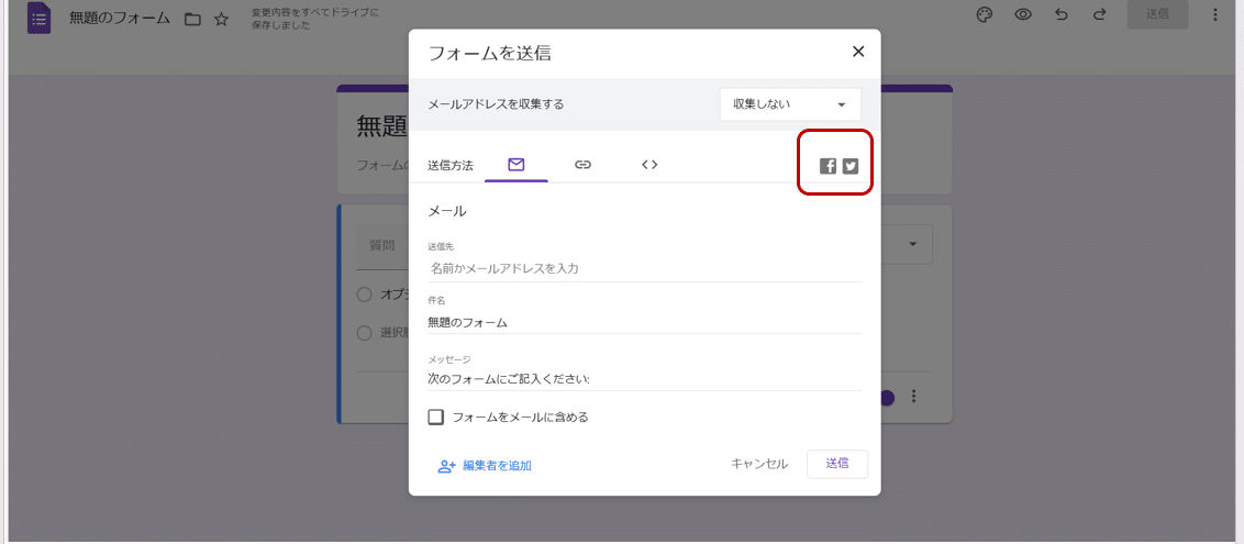 送信ボタンをクリックして、フォームを掲載したいSNSをクリックしましょう。各SNSの手順に従ってくださいね。