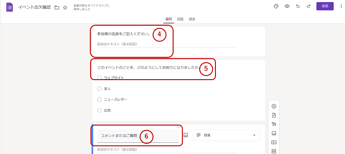 参加の有無や氏名など必ず聞いておきたい項目は「必須」にしておきましょう。