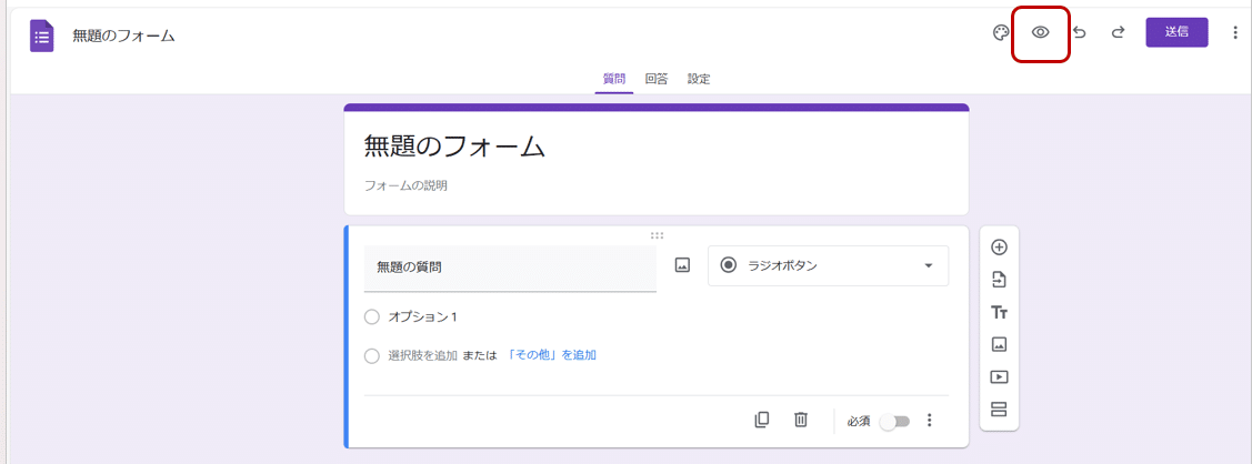 テンプレートから作成でも空白のフォームから作成でも、完成したら目のマークをクリックしてプレビュー表示しましょう。