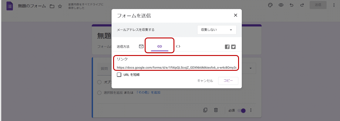 メール送信と同じように送信ボタンをクリックしたら、リンクアイコンをクリックしてURLをコピーします。