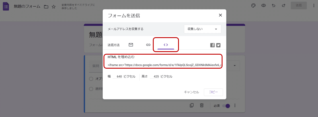 作成したフォームをWebサイトやブログに埋め込んで共有する方法です。