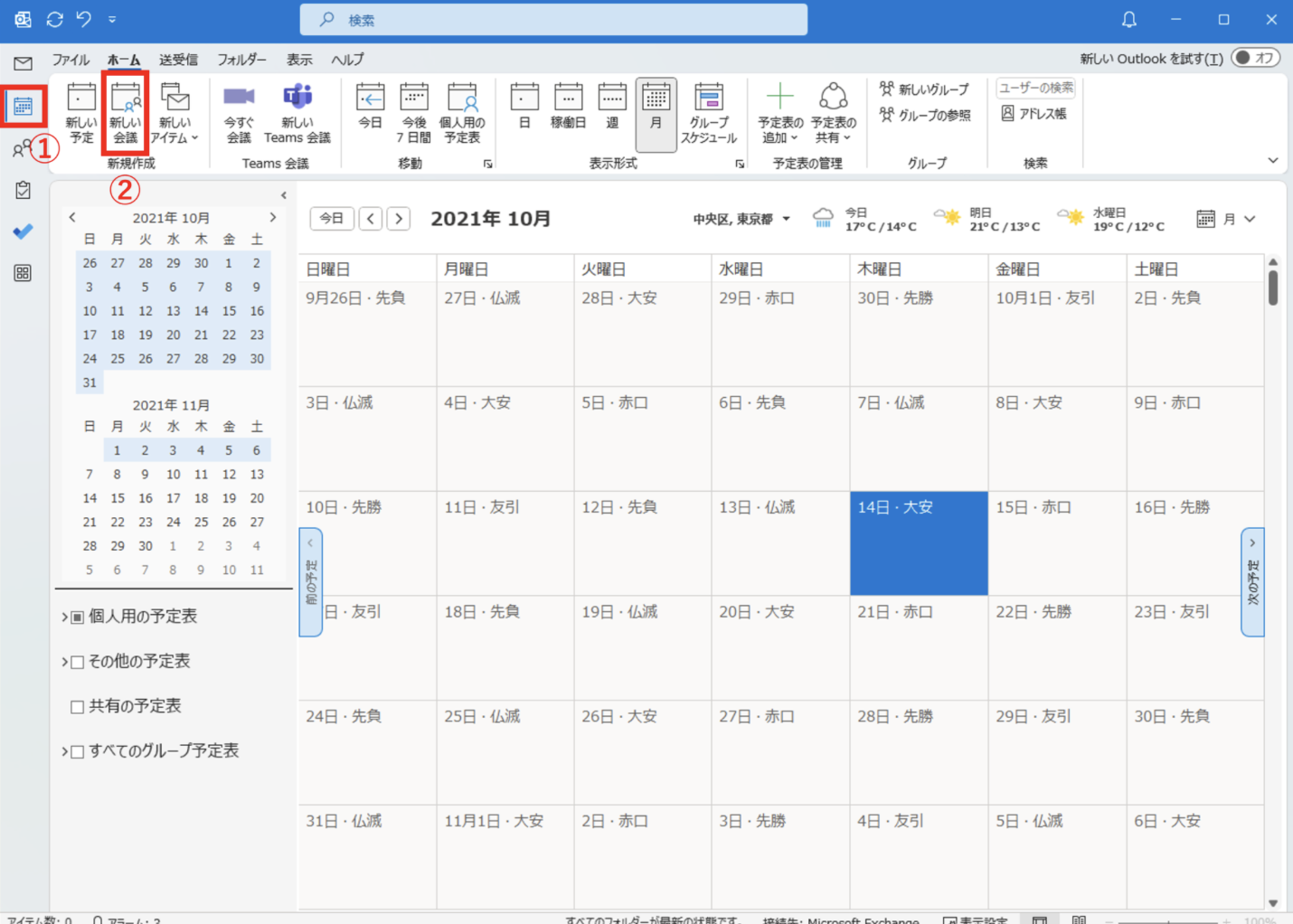1.まず、Outlookを開き、カレンダーを表示します。次に、スケジュールアシスタントを起動するために、会議の新規作成を選択します。