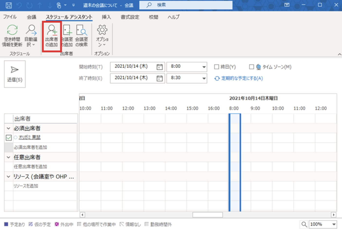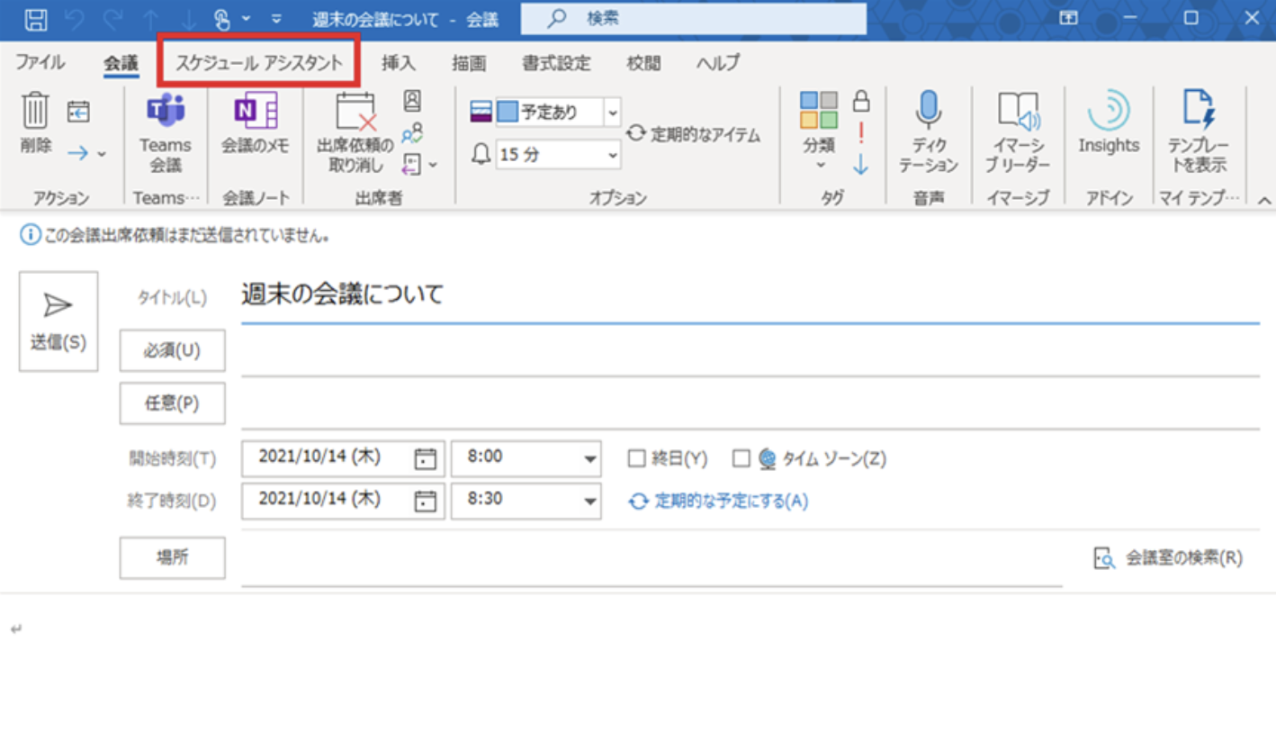 実際にoutlookでのスケジュールアシスタント機能を使ってみましょう。