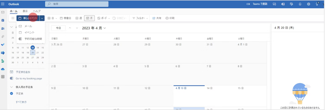 1.outlookから「イベント」を作成します。