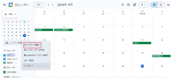 2.カレンダーの左メニュー「他のカレンダー」にカーソルを合わせ「+」をクリックし「カレンダーに登録」をクリック