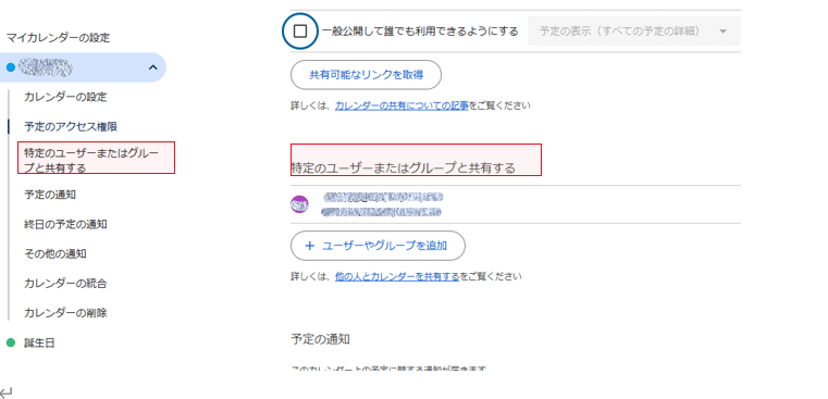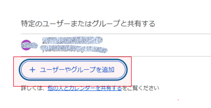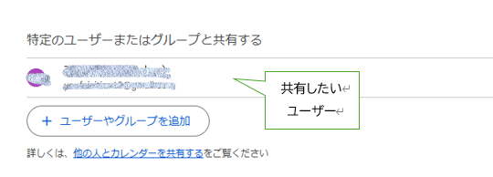 特定のユーザーとカレンダー共有する場合、「特定のユーザーまたはグループと共有する」項目の下に共有するユーザー名が表示されます。