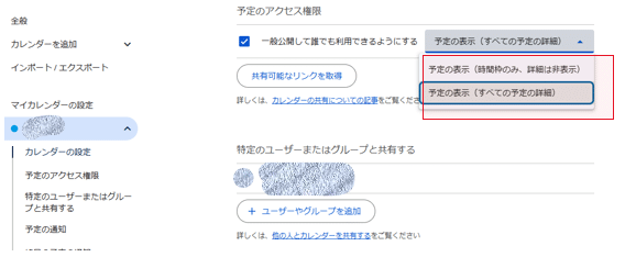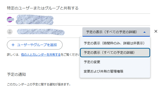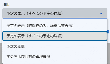 アクセス権限の種類に関しては、「予定の表示(時間枠のみ、詳細は非表示)」「予定の表示(すべての予定の詳細)」の2種類から選んでください。