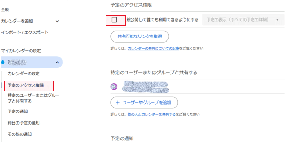 まず「予定のアクセス権限」項目の下にある「一般公開して誰でも利用できるようにする」の左枠をクリックして、チェックマークを入れます。