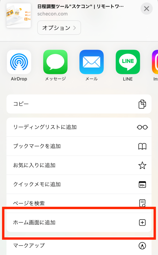 出てきたメニュー内から「ホーム画面に追加」を選択。