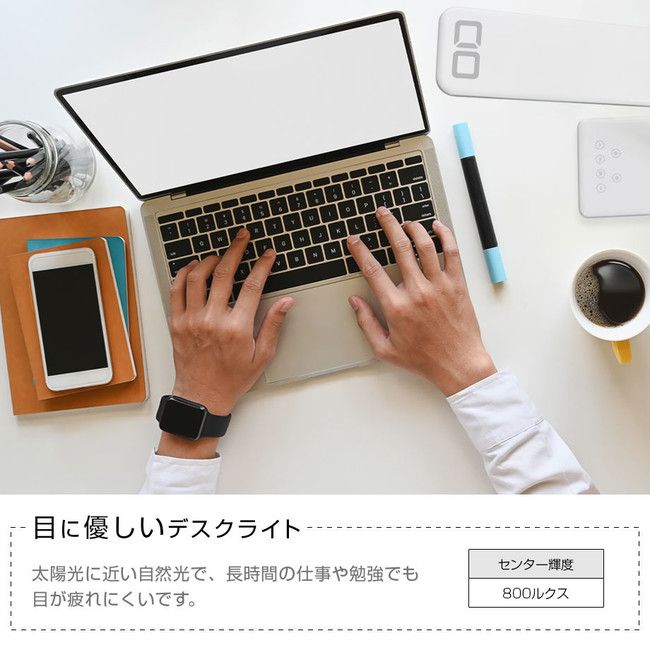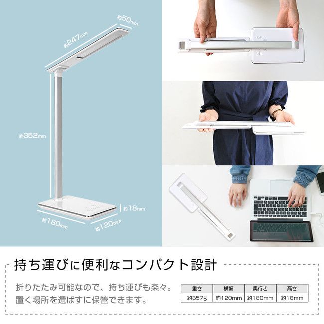オフィス、学習机、書斎、読書、ベッドサイドなど様々なシーンでお使いいただけます。テレワーク・在宅勤務のデスクワークにも便利なサイズでデスク周りの邪魔になりません。モバイルバッテリーでも使用可能なのでアウトドア、いざというときは災害用としてもお使いいただけます。