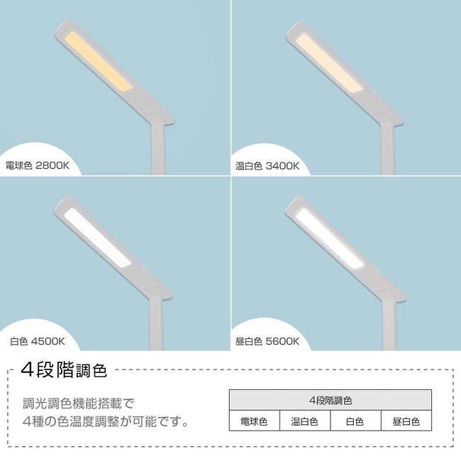 節電・省エネでちらつきが少ないので、目に優しく長時間の仕事や勉強でも目が疲れにくいです。5段階の調光、4段階の調色(昼白色・白色・温白色・電球色)がタッチセンサーで調整可能なので、シーンに合わせてご使用いただけます。LEDライトは角度調整も可能で、LEDヘッド部分が約135° スタンドの角度は約90°と自由な角度で合わせることができます。使用しない時はコンパクトに折り畳み、収納することができます。