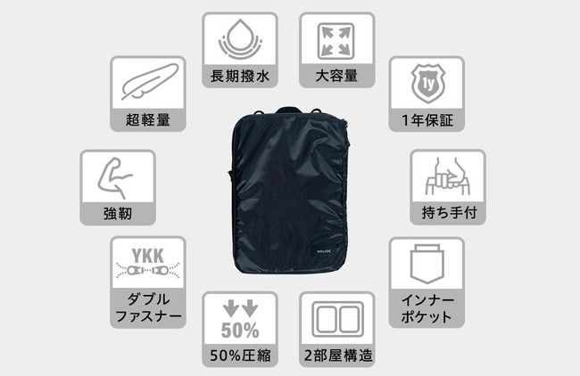 - ファスナーを閉めるだけで、スムーズに50%超の圧縮