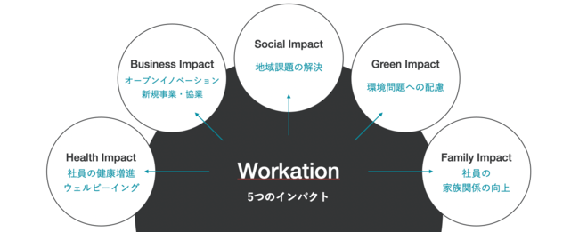 しかし、5年後の働き方コンソーシアムでは、ワーケーションは「旅先で業務を行う」といった執務環境・景色を変えることだけではなく、個人のワークライフバランスの向上をもたらし、新しい事業アイデアの創造や人材育成にも繋がると考えています。時間の使い方、場所、出会う人が変わることで、以下の「5つの効果」が期待できます。