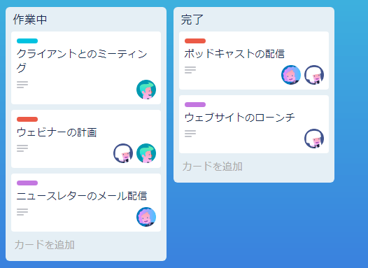 カードは、管理したいタスクや覚えておきたいアイデアを記入するカードです。Trello では基本的にタスクをカードで管理して削除や追加を行うことでプロジェクトごとのタスク量を可視化できます。