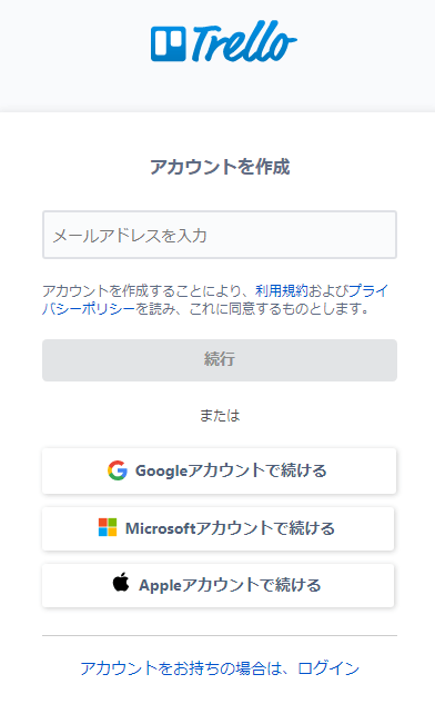Trelloのアカウント作成は、メールアドレスでの登録以外にも、 Google 、Microsoft 、apple のアカウントのどれか1つからすぐに行えます。