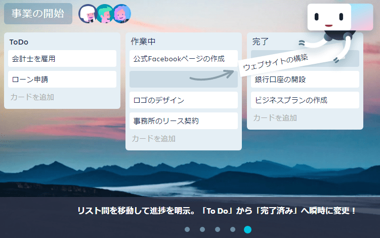 このカード、リスト、ボードを組み合わせて使うことで、普段タスク管理が苦手という方でも直感的に操作ができます。特に嬉しいのは、プロジェクトのボードを見るだけで現在の進捗状況が一目瞭然なため、パッと見て瞬時に把握できること。
