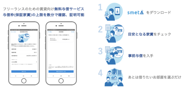 賃貸向け与信サービスです。フリーランスや個人事業主がお部屋探しをする際、smetaを通じて適切な評価(事前与信)を供与し、与信枠として“借りられる家賃額の上限”を事前に把握した状態を作り出すことで、与信枠に収まる範囲であれば入居審査を100%通過でき、正規雇用者同様の簡単かつ円滑な賃貸住宅選択が可能です。