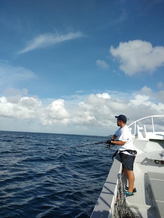 漁船に乗って、近海へ。ハタや旬のヒラマサ、ブリなどを狙います。稀に10kgを超える大物を釣り上げることも!