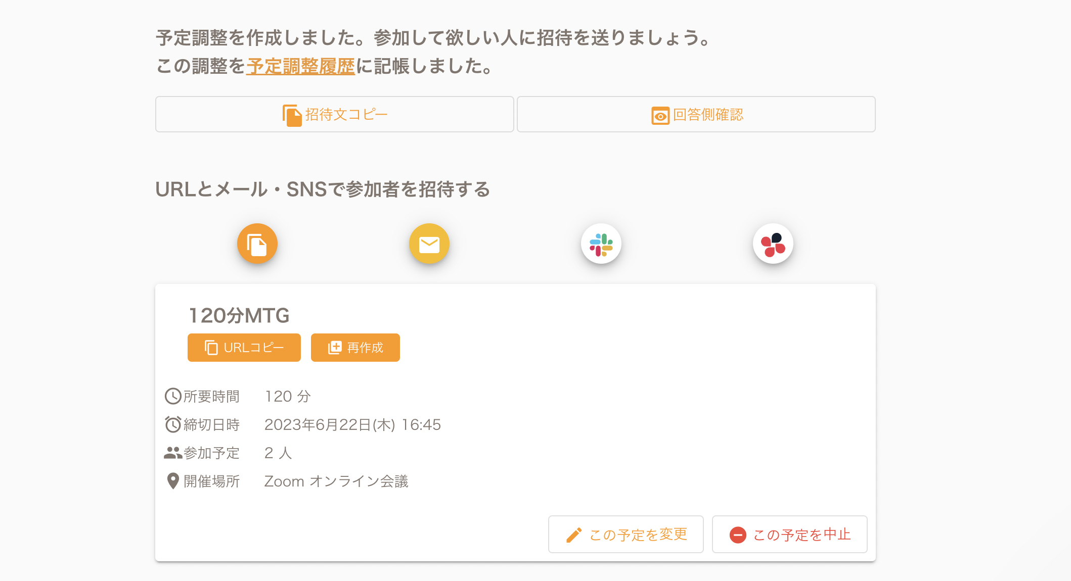 スケジュール調整フォームを作成し[予定調整を作成 >]ボタンを押せば、スケコンでのスケジュール調整は完了です。