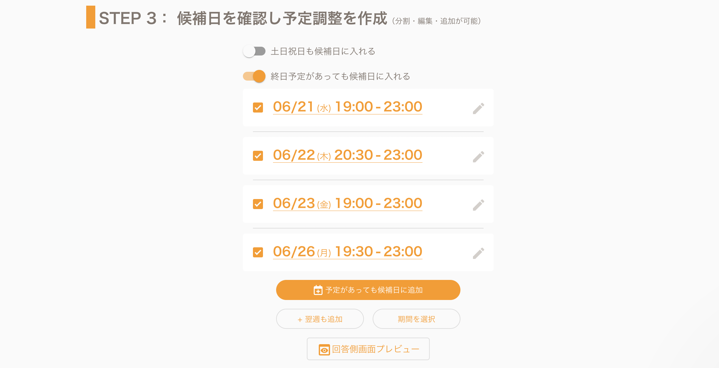さらにメールやSNSでのスケジュール調整フォームの案内メッセージをコピーできるため、抽出した候補日をもとにアンケートを作成することも可能です。