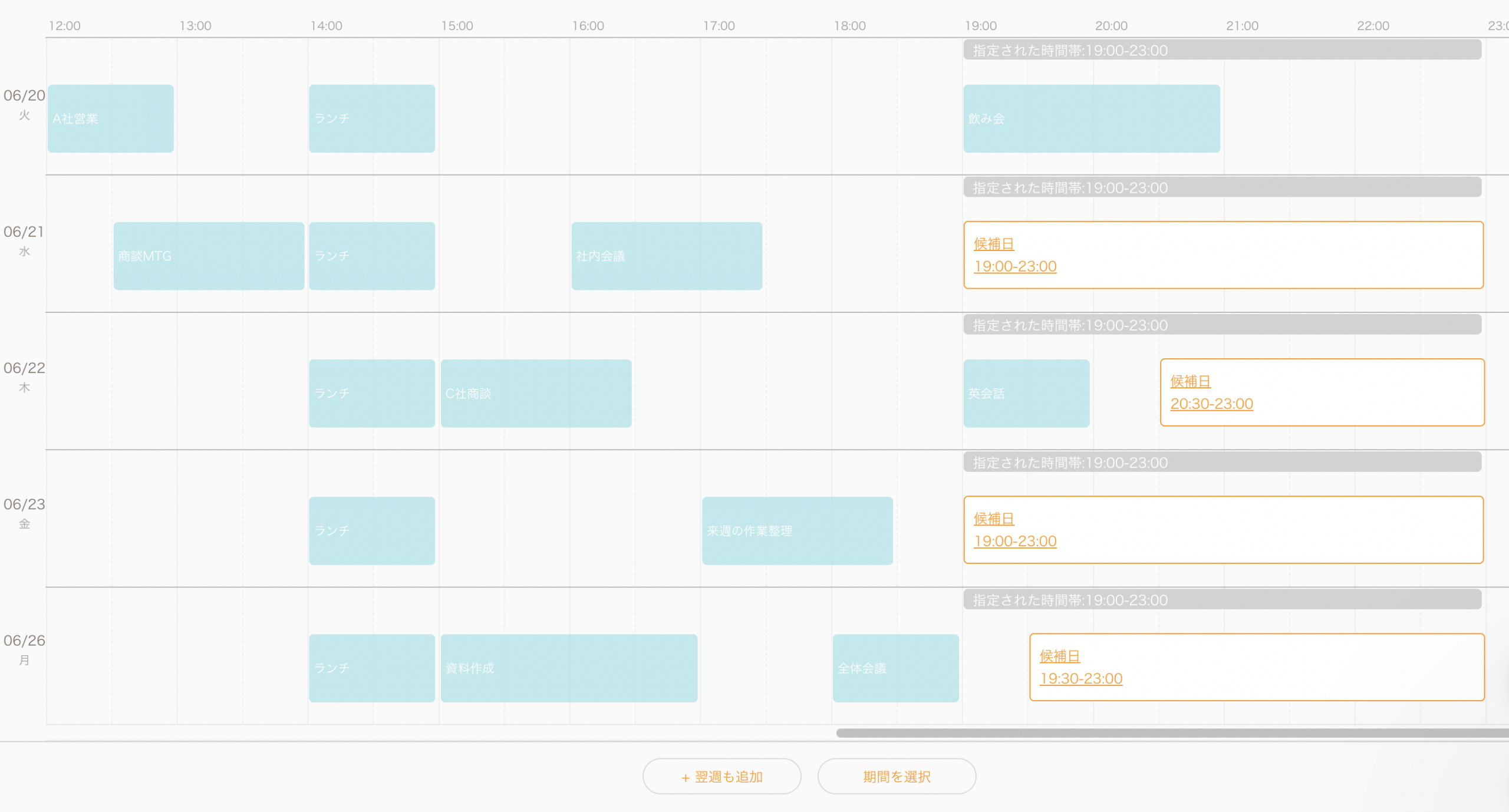 さらにカレンダー情報と候補日は、視覚的なスケジュール表としても表示され、予定が埋まっている時間帯の内容についてもひと目で確認できます。