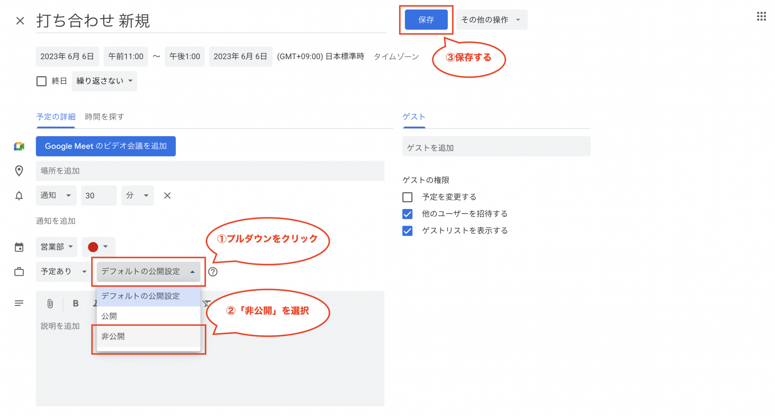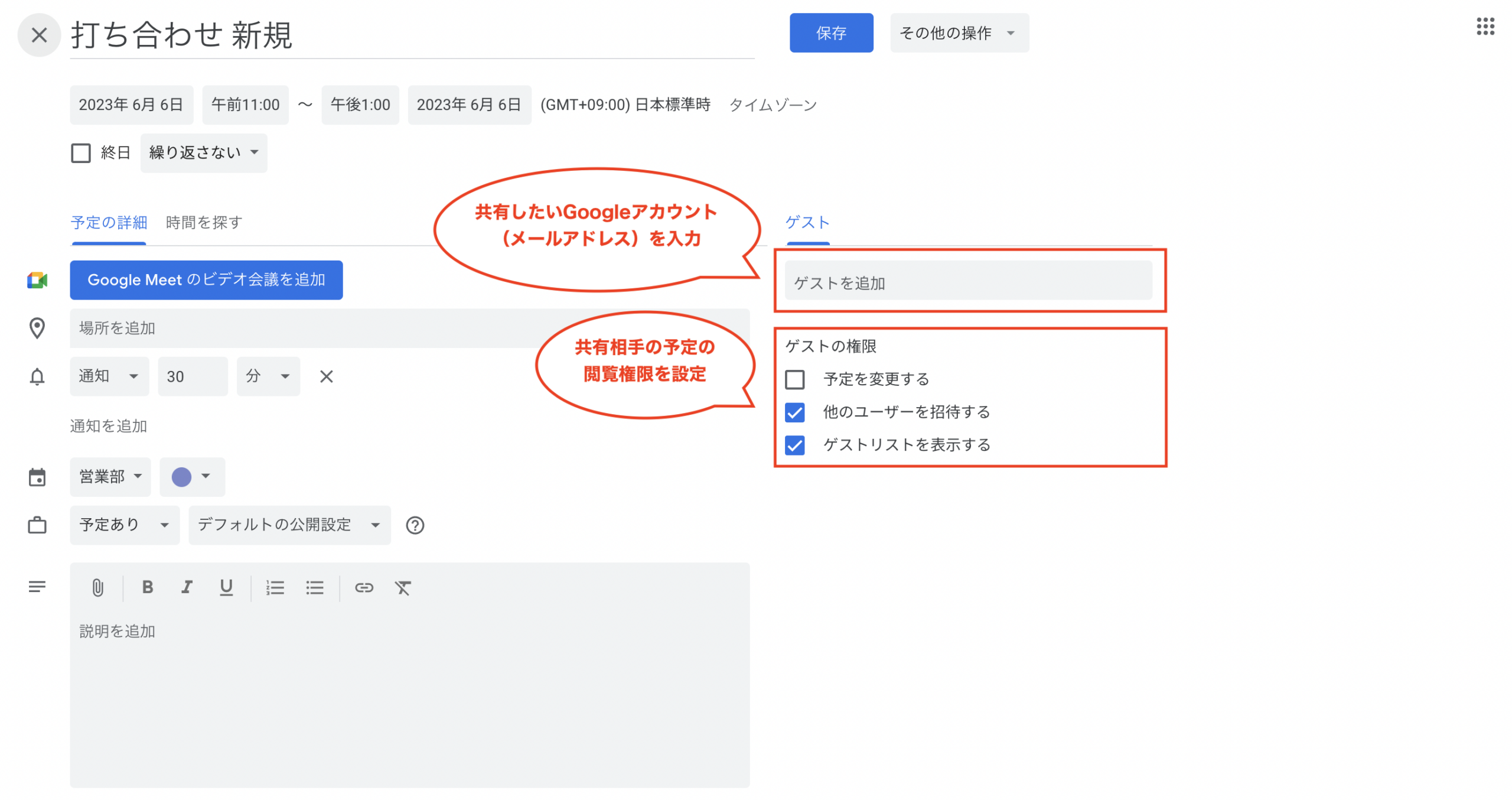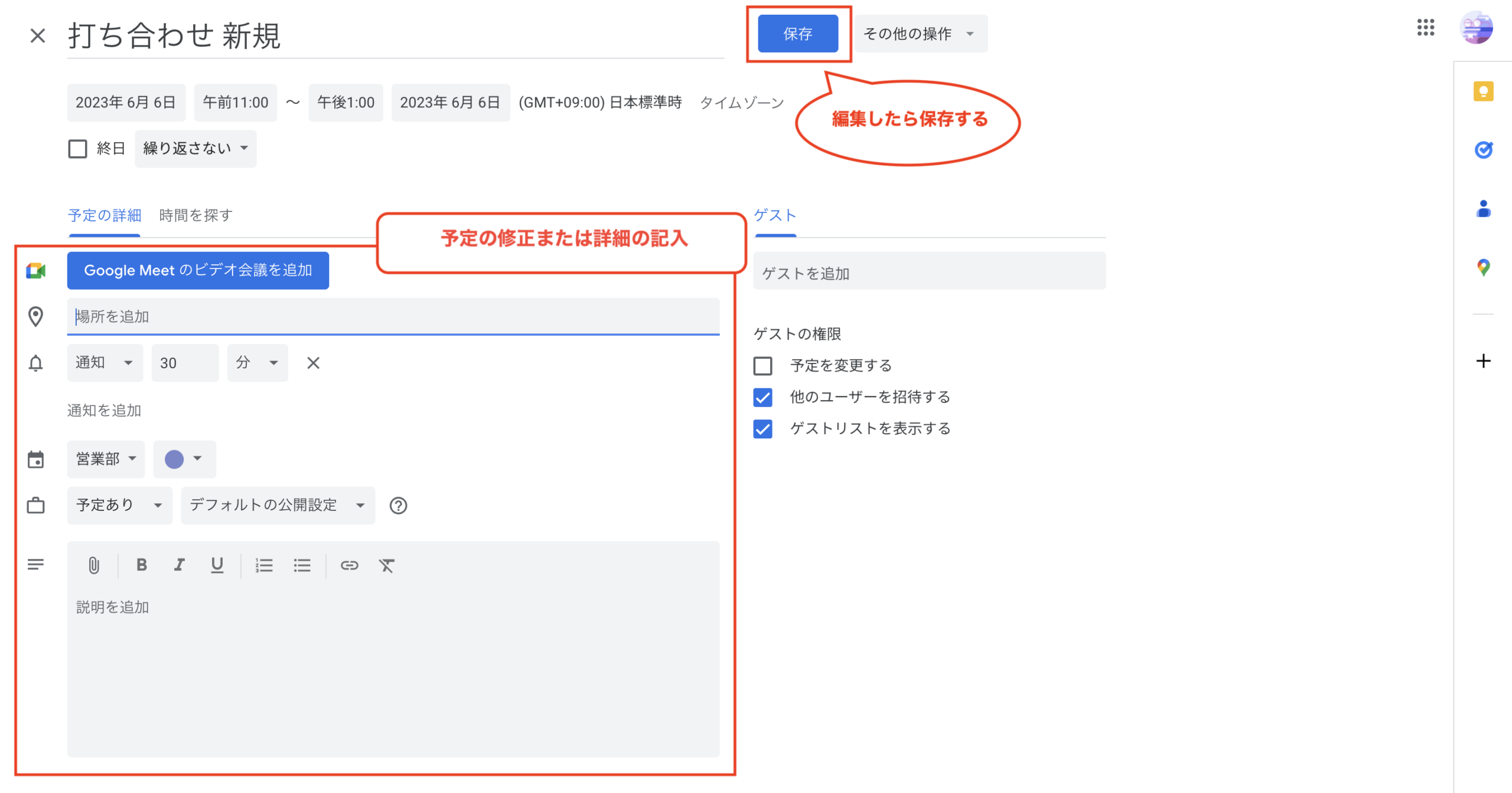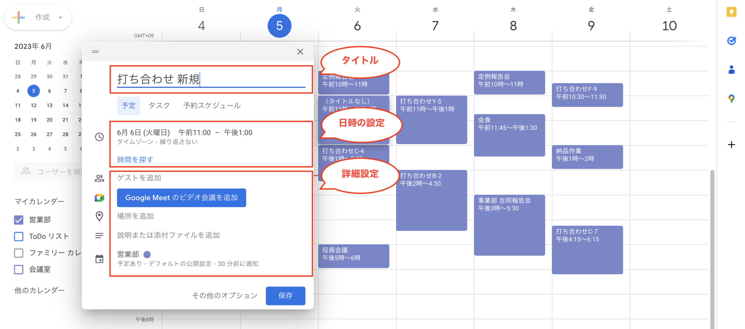 ②タイトル、日時や詳細を入力する