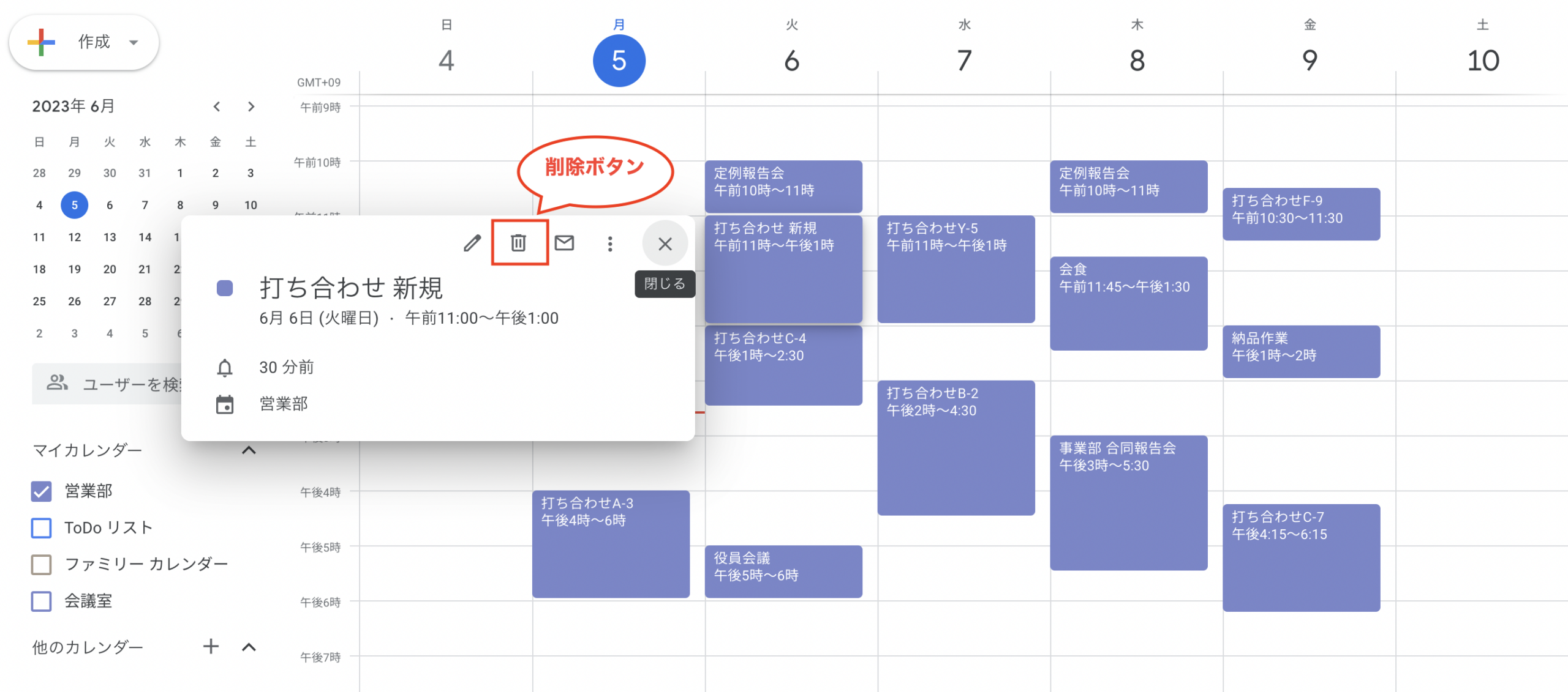 ②右上に表示されるゴミ箱マークのアイコン(予定を削除)をクリック