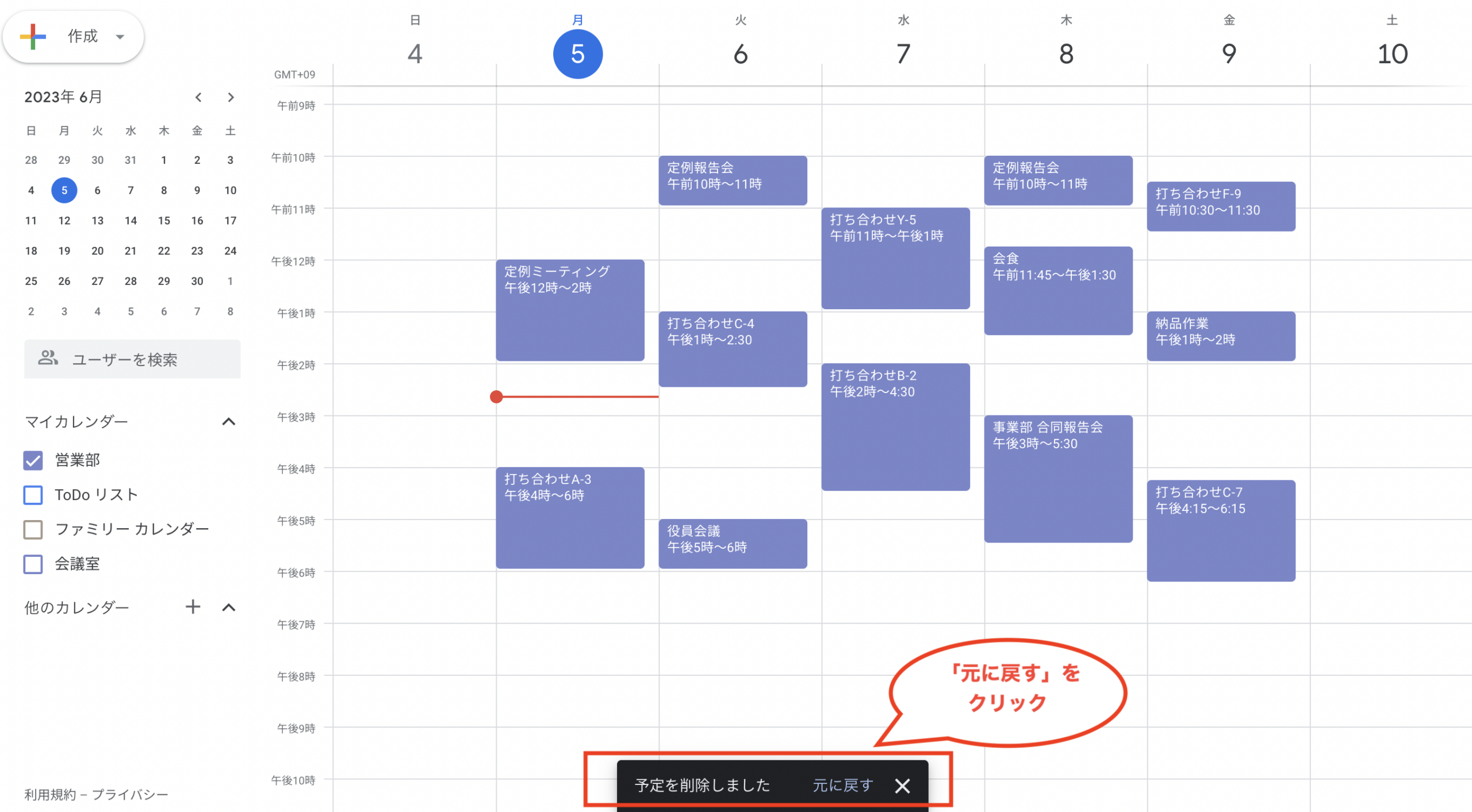 ③削除後すぐに削除を取り消したい場合は、画面下に表示される「元に戻す」をクリック