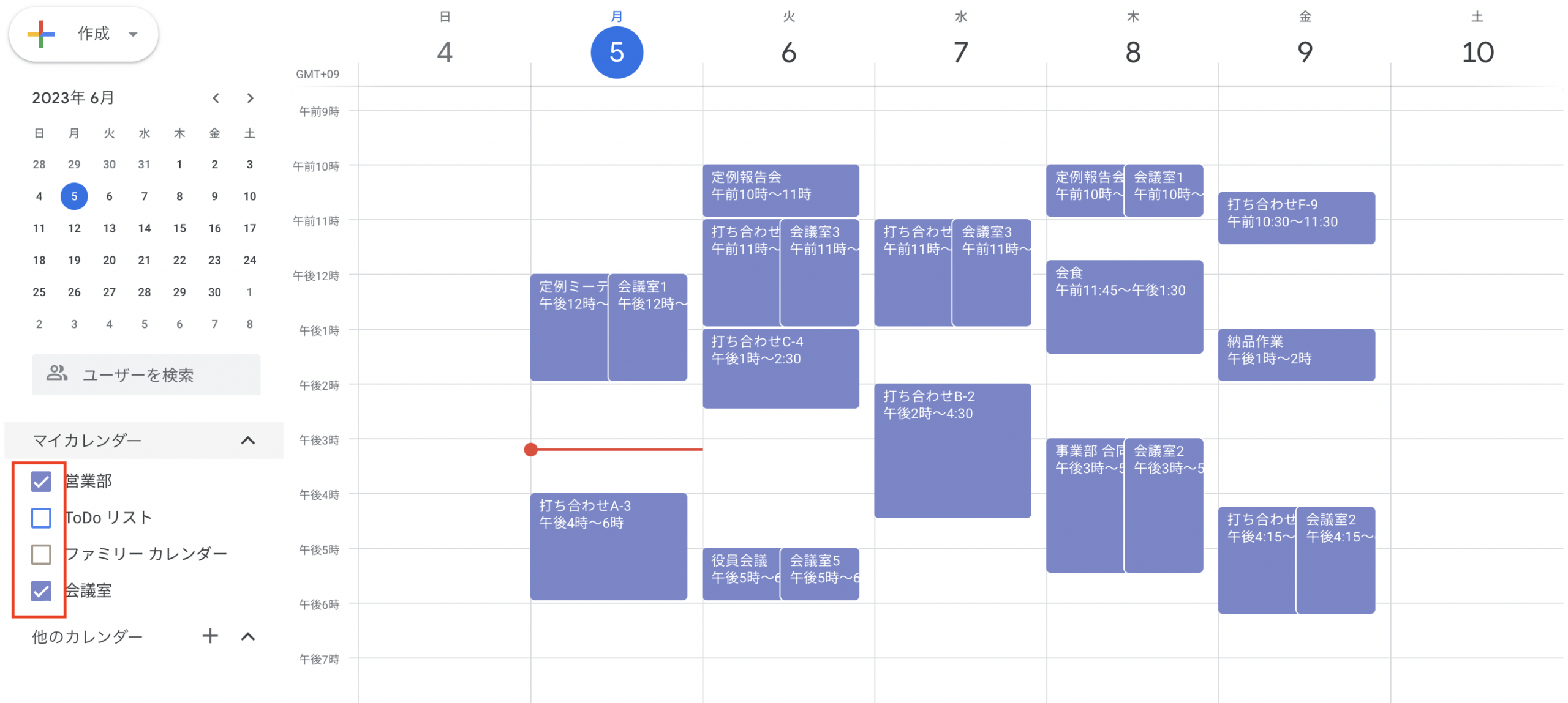 自分のカレンダーと共有されたカレンダーの予定は、カレンダーごとに予定の表示・非表示設定が可能です。