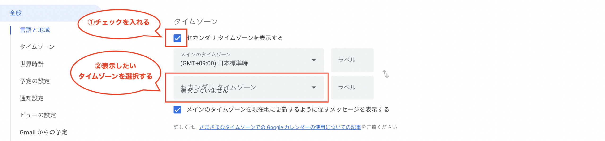 ②タイムゾーンの項目の「セカンダリタイムゾーンを表示する」にチェックマークを入れる