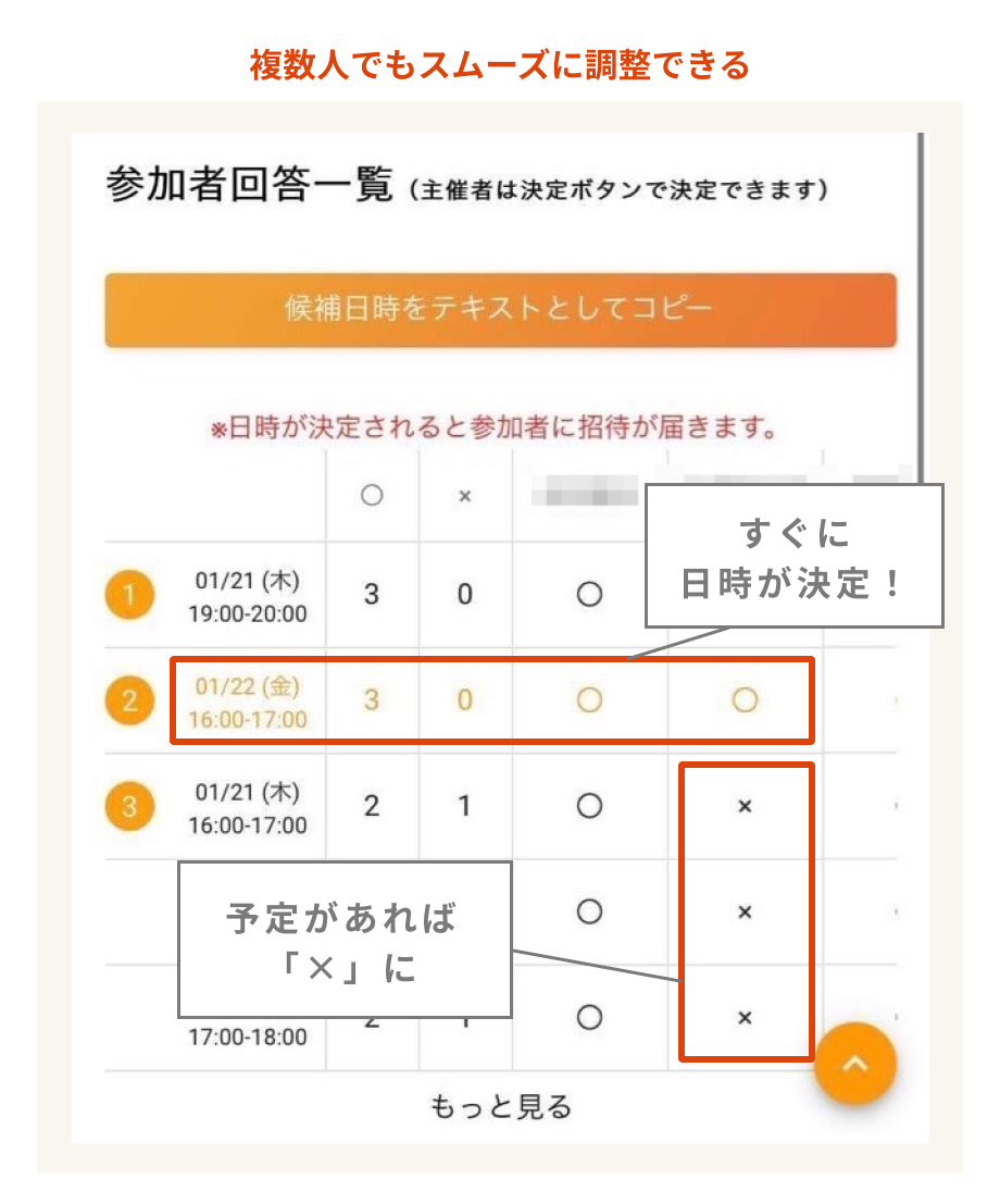 「後から調整する必要が発生してしまい、なかなか日程が決まらない……」という面倒な事態も避けることができます。