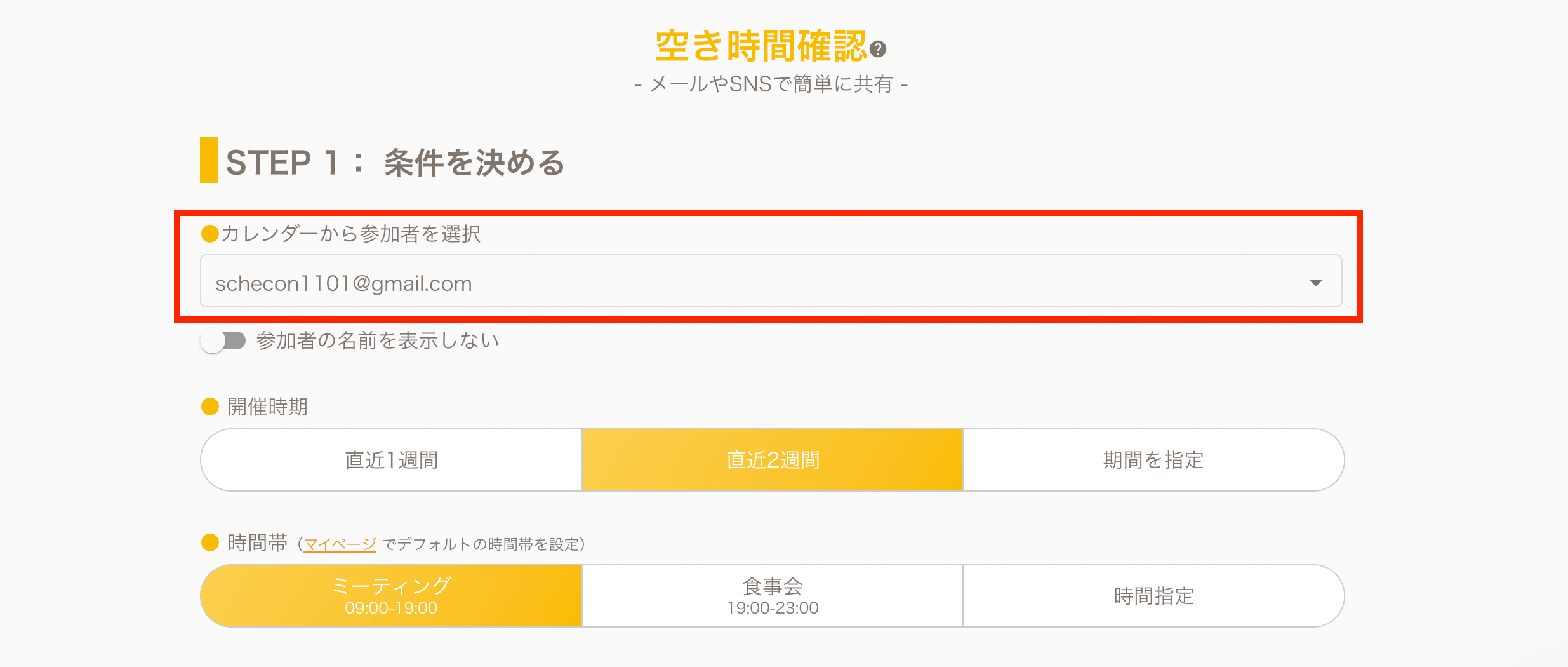 空き時間確認機能を開いたら、[STEP1]で空き時間を抽出したいGoogleアカウントを選択します。
