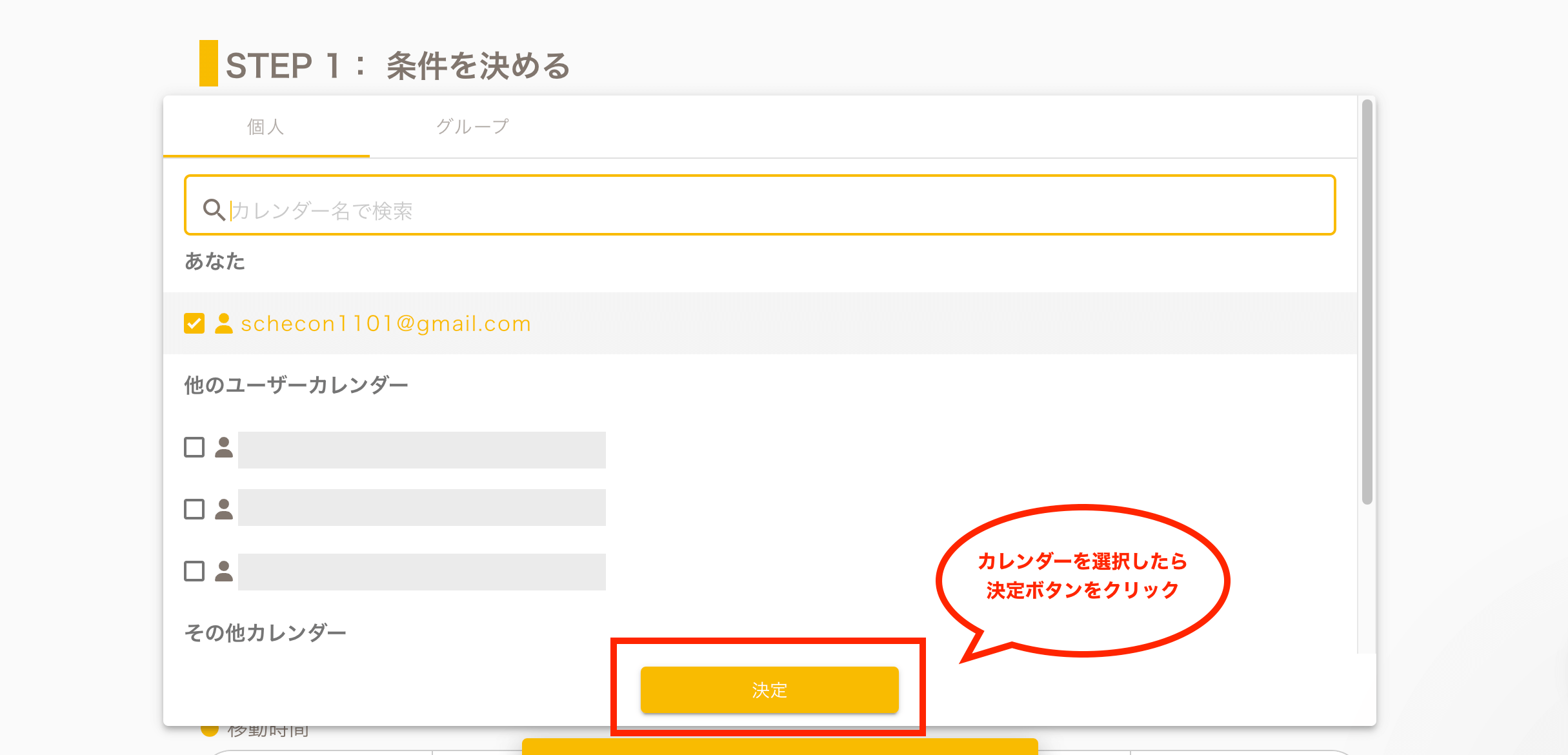 登録しているGoogleアカウントの一覧が表示されるため、カレンダーから空き時間を抽出したいアカウントにチェックを入れて、決定ボタンを押してください。