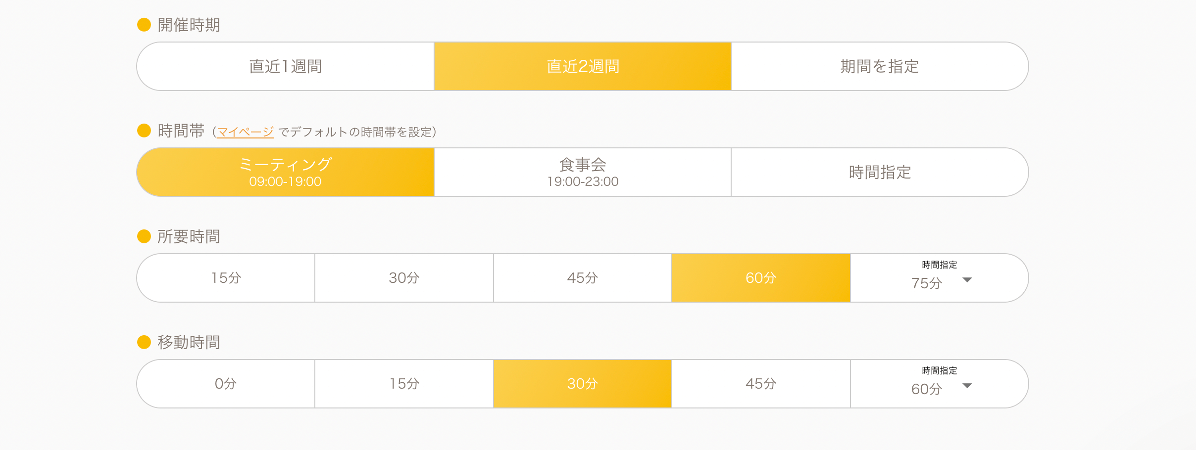 さらに選択画面下部の[開催時期][時間帯][所要時間][移動時間]を調整して、空き時間を抽出する条件を絞ります。