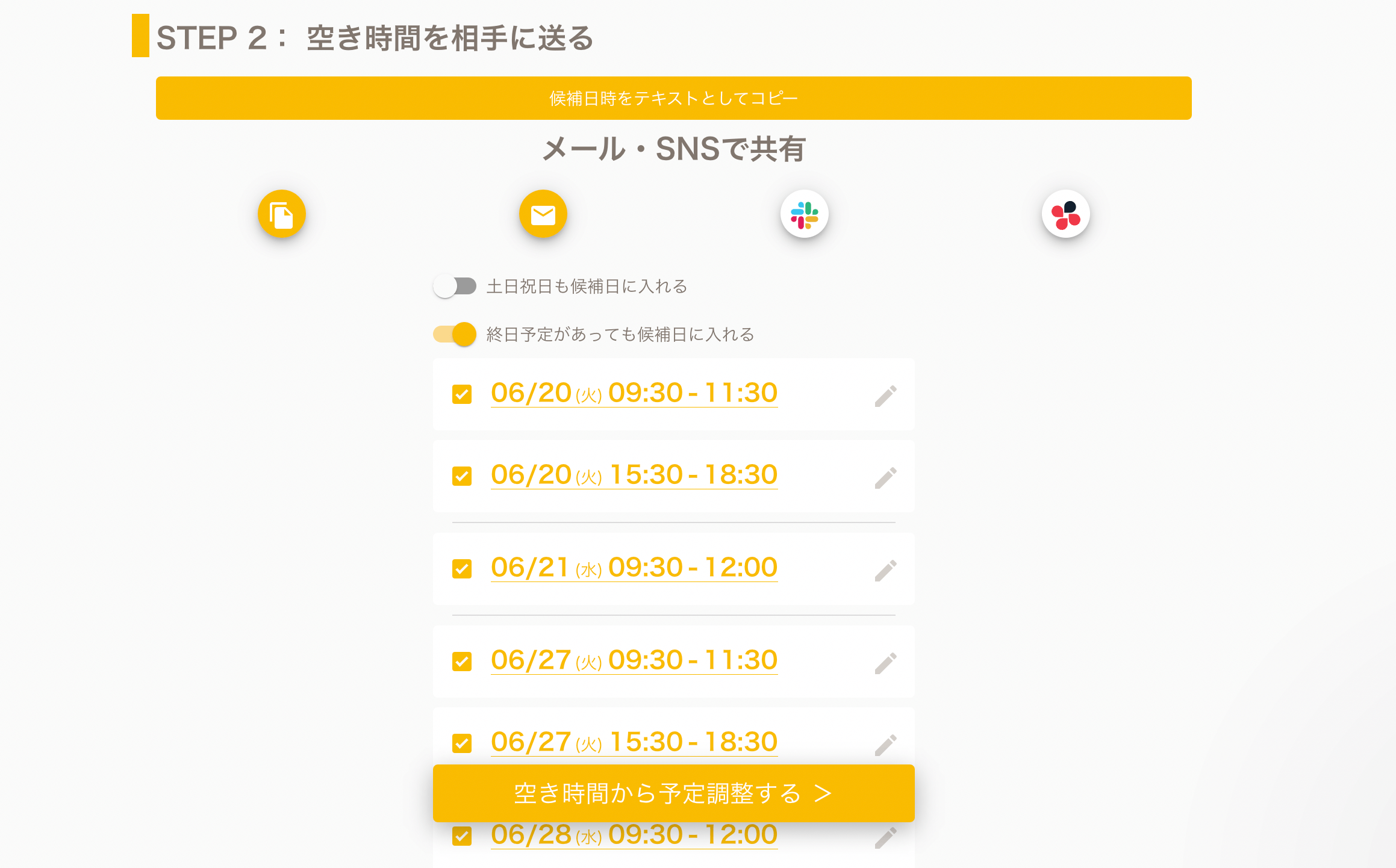 あとは候補日時をコピーしてメールやSNSで共有するほか、空き時間の中から予定を入れたい日程を選択して日程調整することも可能です。