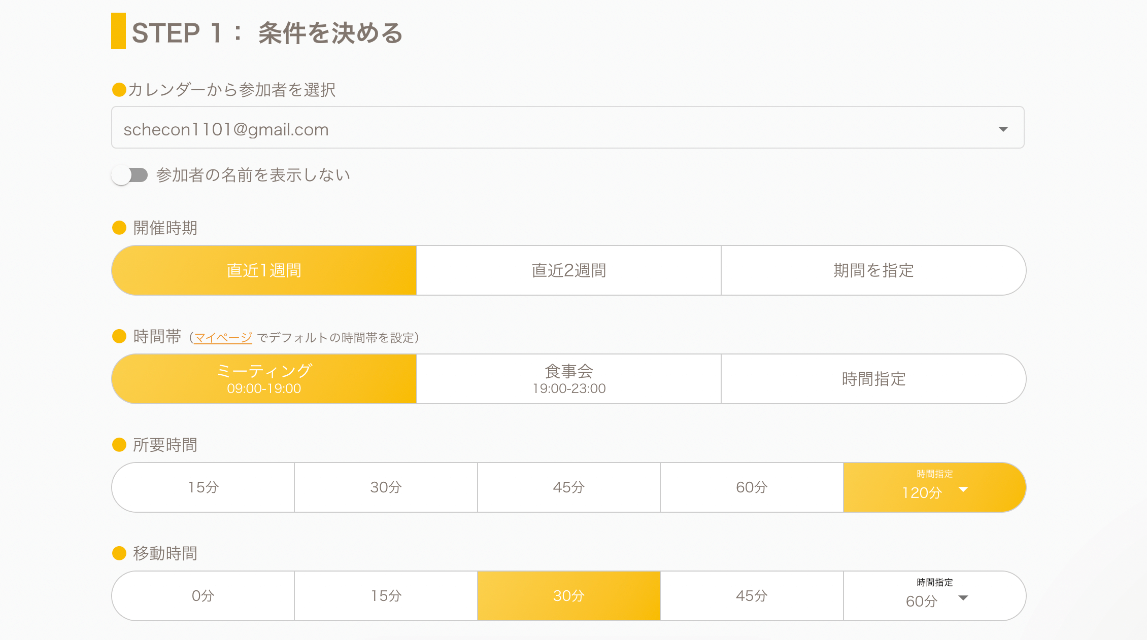 まずは空き時間を抽出したいアカウントや日時・期間を入力していきます。