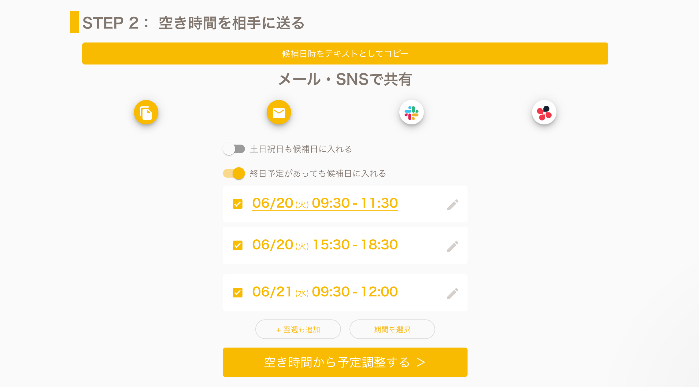 それだけで、後はAIが空き予定を導き出してくれます。