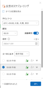 投票のスケジューリングとは、主催者側があらかじめ候補日を設定し、相手側がその候補日から希望する日時に投票することで日程が調整できる機能です。