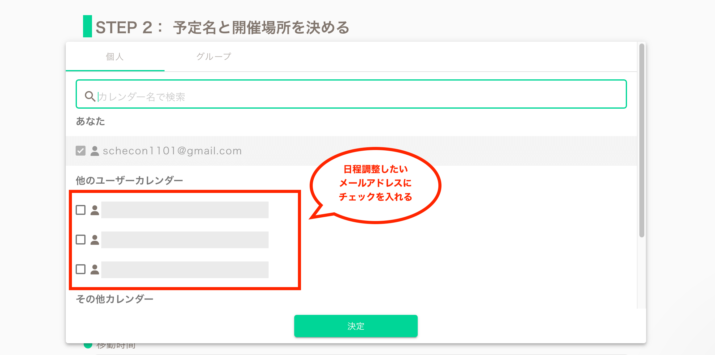 スケジュール調整の際にメールアドレスにチェックを入れるだけで、カレンダー情報をもとに瞬時にスケジュール調整できます。