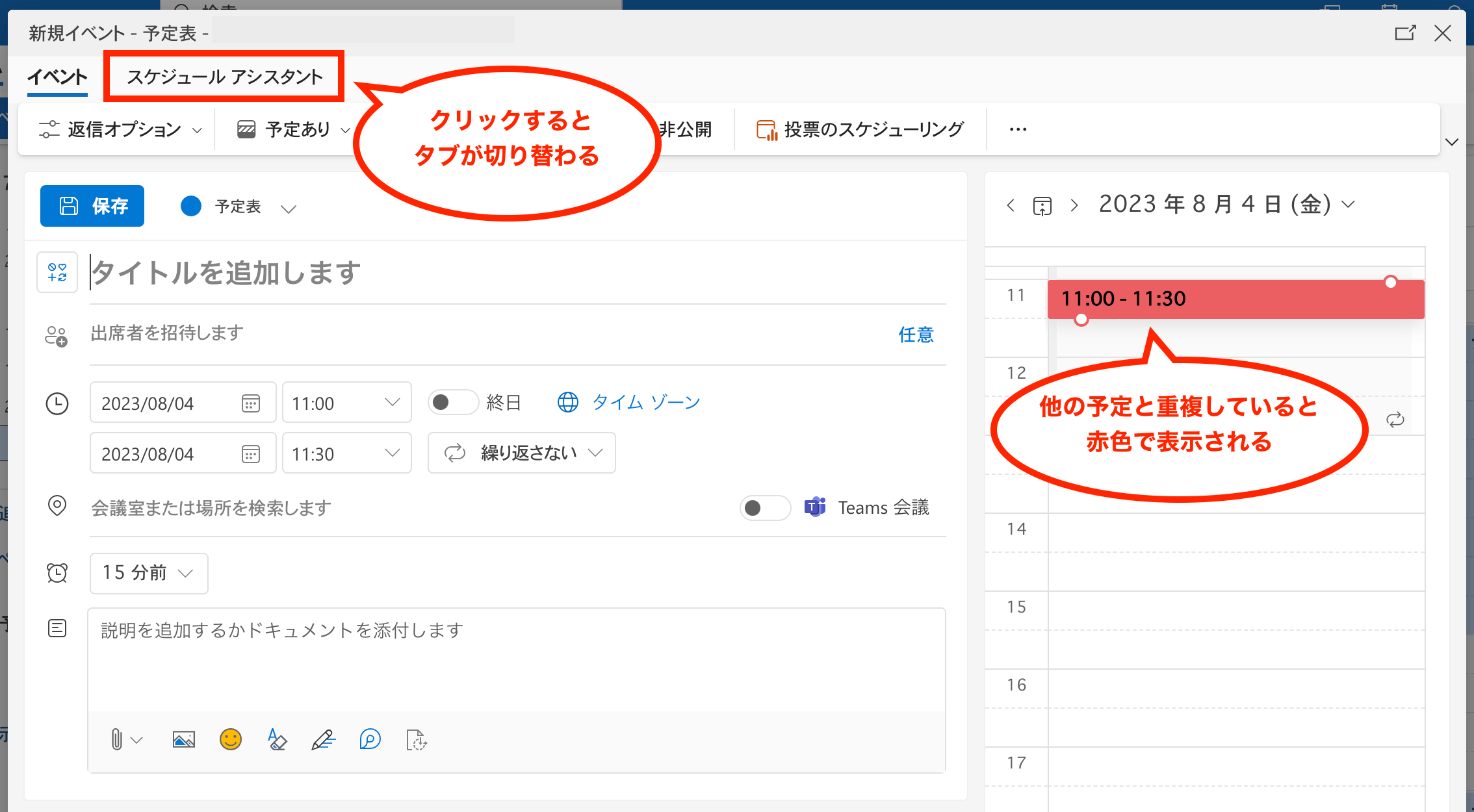 - Outlookの予定表の新規作成を開き「スケジュールアシスタント」というメニューをクリック