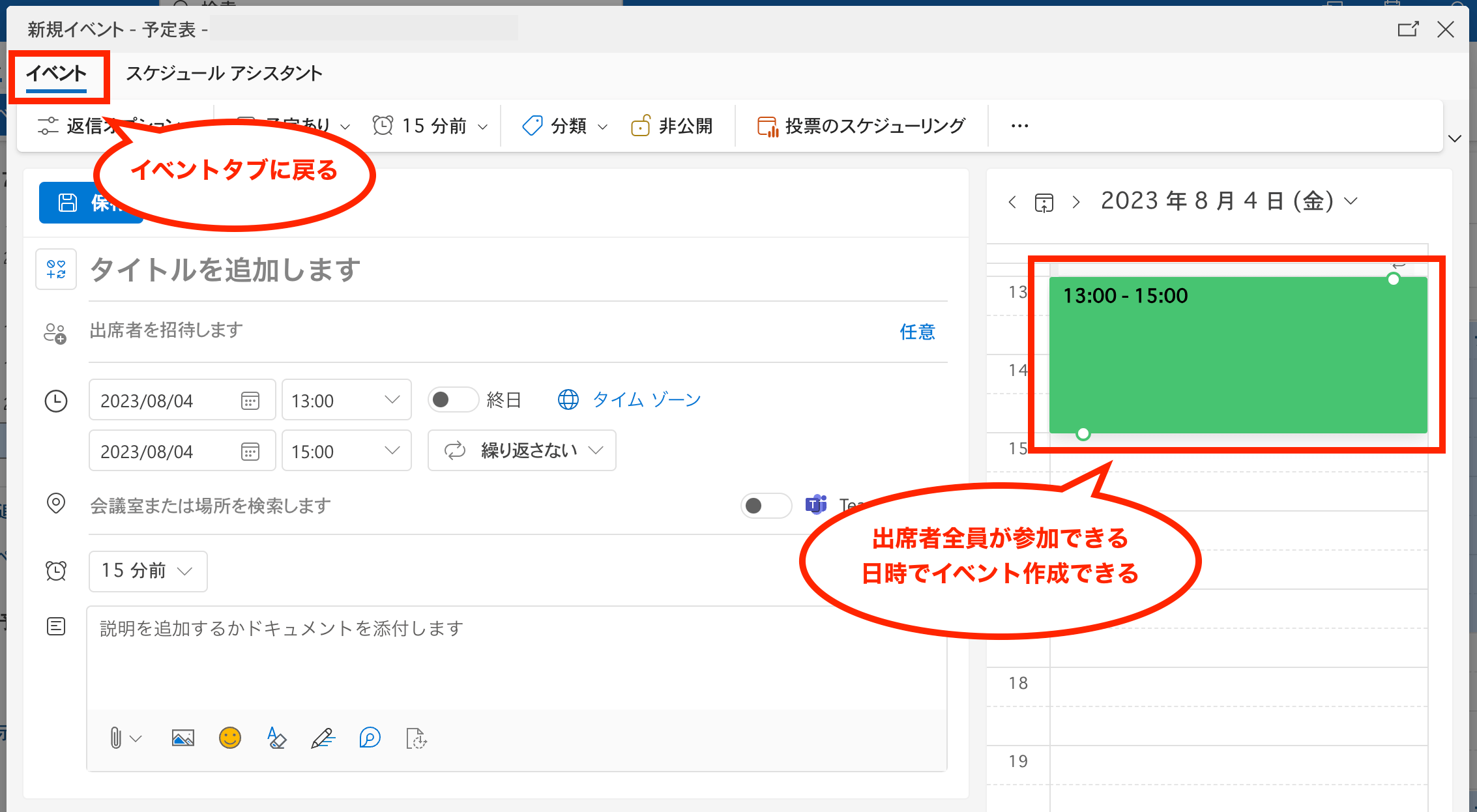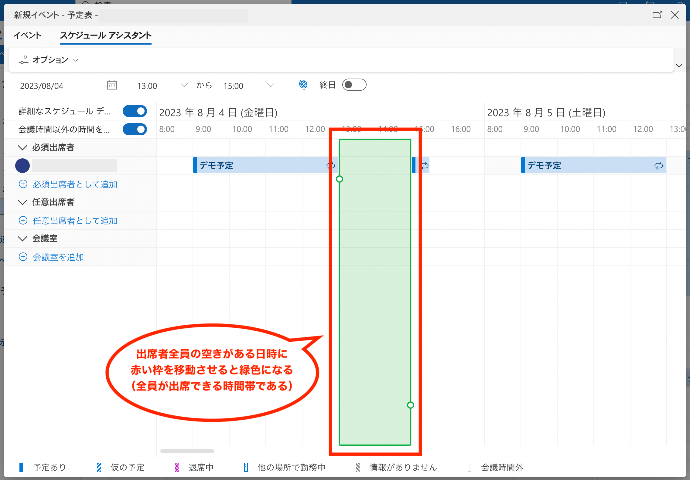 この機能を活用すれば、全員の空き時間を見つけて会議予定を済ませられるのです。
