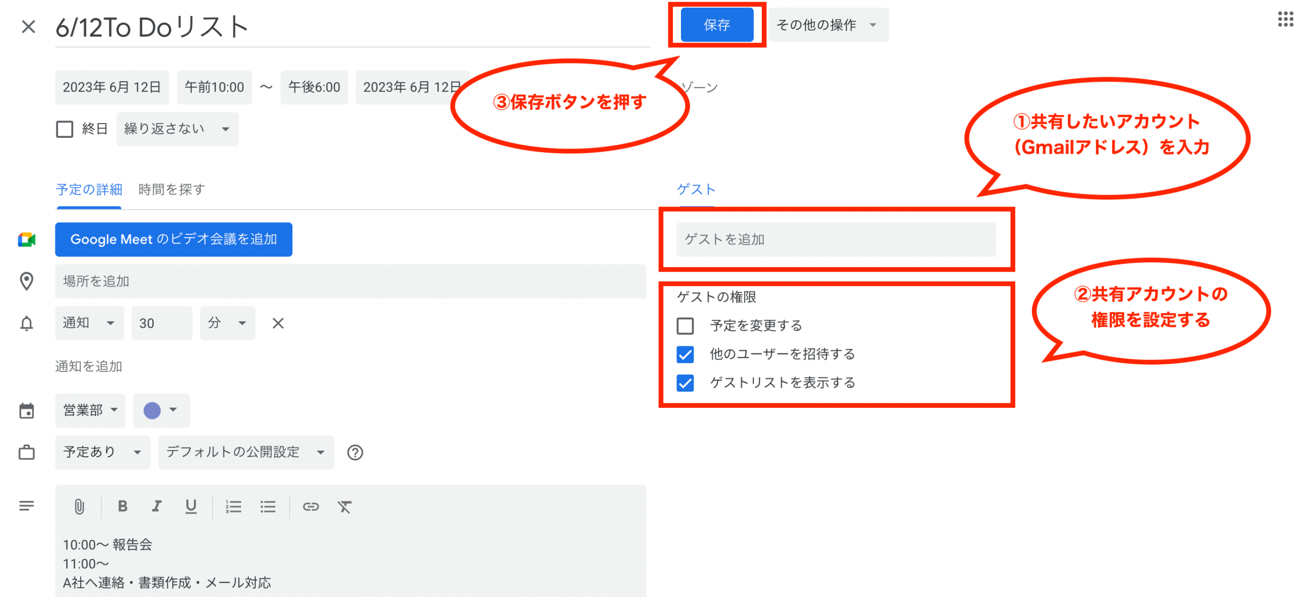 この方法でタスク共有を行うにあたって、もしも予定の更新を相手にも行えるようにしたい場合には、予定の編集権限を相手側にも与える必要がある点に注意してください。