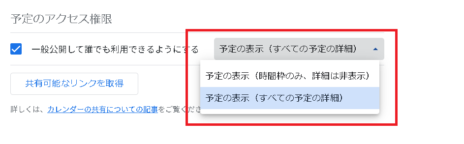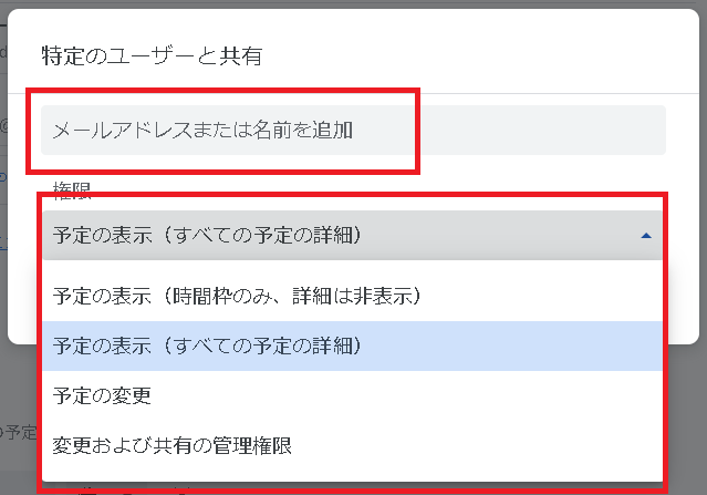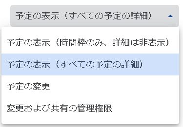アクセス権限は「予定の表示(時間枠のみ、詳細は非表示)」または「予定を表示(すべての予定の詳細)」の2つから選択できます。