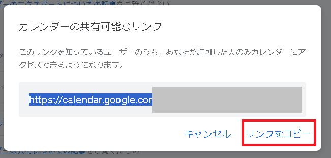 カレンダーのリンクのurlが表示されるので、画面右下に表示されている「リンクをコピー」を押してコピーします。
