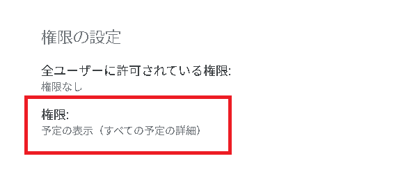 この内、権限が「予定の表示(時間枠のみ、詳細は非表示)」になっていると、予定の詳細を表示できなくなってしまいます。